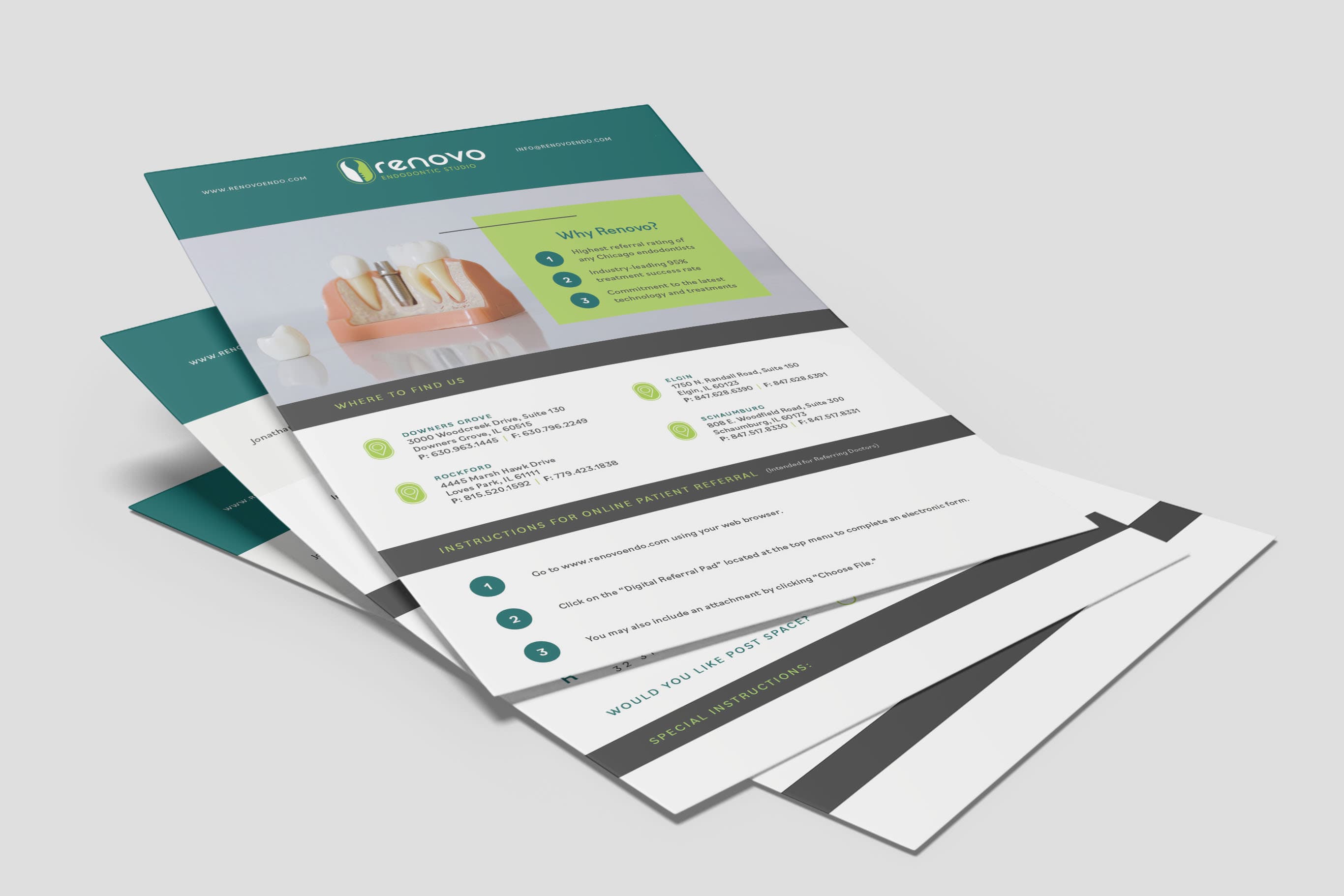 Research revealed that patients seek premium care from trusted, local providers, so we refined the brand to establish Renovo as the friendliest face in endodontics. This refreshed branding is reflected on the new website, renovoendo.com, along with updated contact and referral forms. These efforts were supplemented by an organic content strategy, Google search ad campaign, and printed collateral all aimed at driving traffic and increasing conversions.